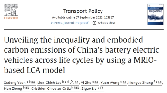 本网消息 环境科学与工程学院联合培养研究生袁旭东作为第一作者的研究论文,近日被国际权威期刊《Transport Policy》正式接收。该论文题目为“Unveiling the inequality and embodied carbon emissions of China's battery electric vehicles across life cycles by using a MRIO-based LCA model”,发表于中国科学院一区SCI期刊《Transport Policy》。该成果由湖北理工学院牵头,联合长江大学、天津大学、上海交通大学以及国家环境保护环境规划政策模拟重点实验室共同完成。