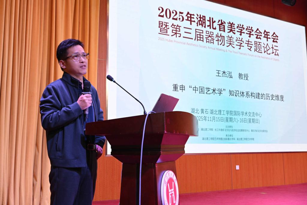 湖北理工学院党委副书记、校长胡国珍致欢迎词。他代表湖北理工全体师生,向远道而来的专家学者致以热烈的欢迎和由衷的感谢。他指出,“艺术学理论”作为省级重点(培育)学科,与学校深厚的工业基因相融合,在工业设计美学、矿冶器物研究等领域形成了独特优势;长江中游矿冶文化与经济社会发展研究中心,更成为挖掘矿冶器物美学价值、传承工业文明的重要研究载体,为学术创新与成果转化提供了有力支撑。本次论坛以“器物美学”为专题,为理工与人文的跨界对话搭建了宝贵平台。本次年会的举办,必将推动各位专家学者围绕数智时代美学转型、器物美学理论深化等议题、凝聚共识;助力我校深化学科交叉、挖掘本土文化价值,为文化创新与设计实践贡献理工力量。