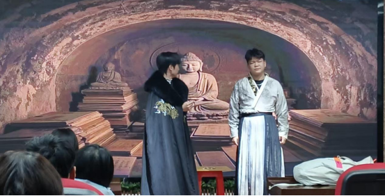 剧情演绎《千佛幻梦》表达家国情怀。六位表演者身着华丽服饰,凭借精湛演技,生动刻画人物,以创新的剧情演绎形式,让敦煌文化“活”了起来。
