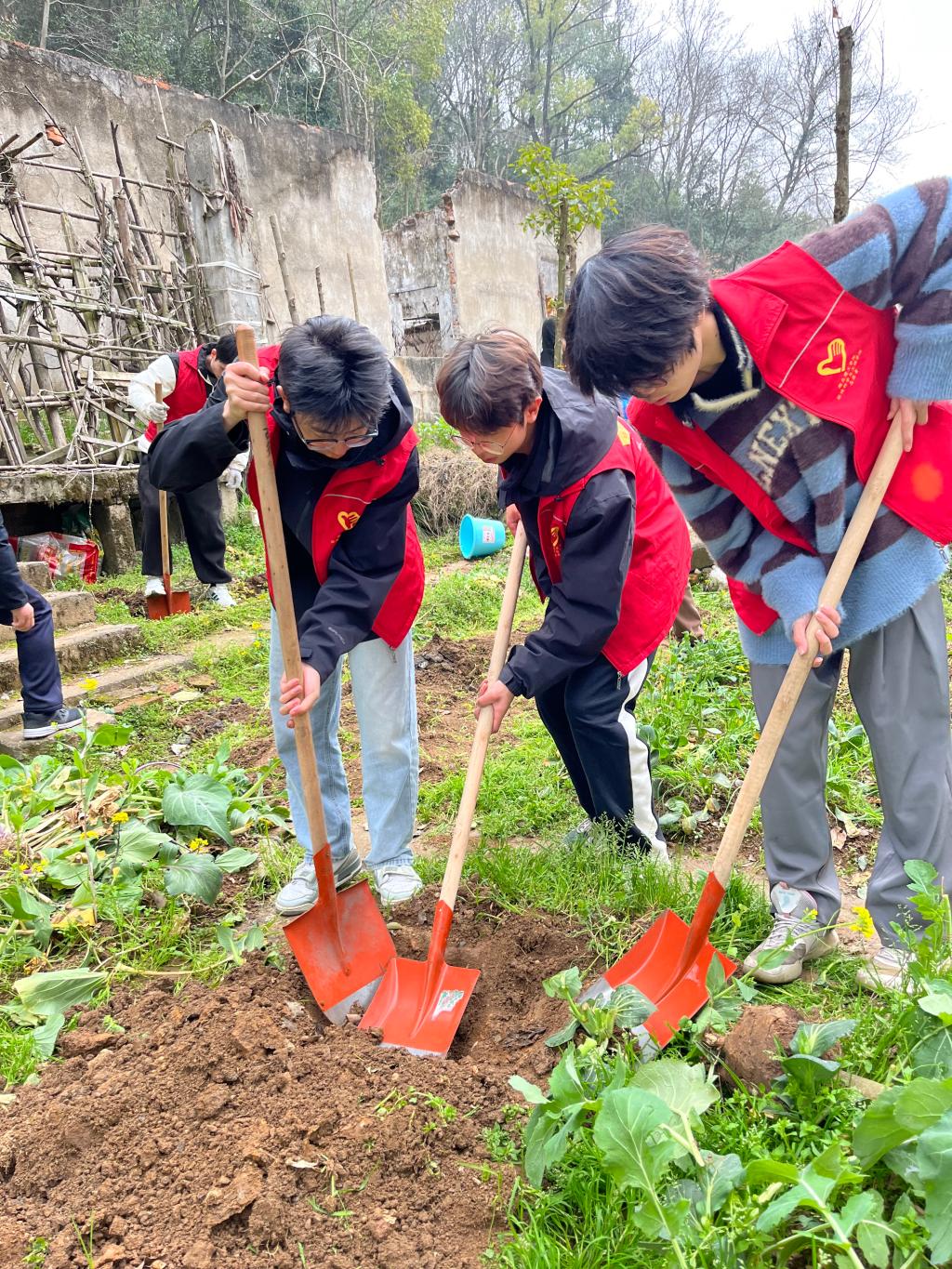 活动当天,学生志愿者与社区居民分工协作,对军转小区内长期闲置的荒废菜地进行集中清理。同学们挥锹铲土、扶苗培土、提水浇灌……现场热火朝天,原本杂乱的荒地逐渐被整齐的树苗点缀,新绿映衬着志愿者的红马甲,成为春日社区一道亮丽的风景。