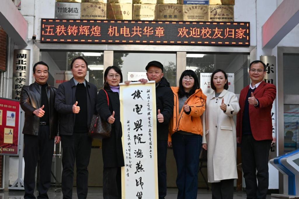 襄阳校友会抵达机电工程学院,学院领导班子热情迎接。湖北理工学院襄阳校友会会长龚建强、副会长应莉、秘书长王少鸿代表襄阳校友会为纪念湖北理工学院机电工程学院高质量发展五十周年,特赠送书法作品一幅。书法作品笔力遒劲,字里行间饱含深情,寄托着襄阳校友会对母校五十年辉煌历程的敬意与祝福。