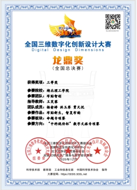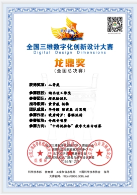 本网消息 近日,第十八届全国三维数字化创新设计大赛年度总决赛在陕西省黄陵县中华始祖堂圆满落幕。经过激烈角逐,我校艺术学院参赛团队凭借出色表现,斩获全国二等奖1项、三等奖1项及优秀组织奖。