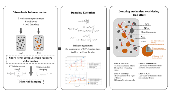 该论文聚焦再生骨料混凝土在持续荷载作用下的阻尼性能演化,提出基于分数导数粘弹性模型的静动态互变理论,深入剖析荷载历史对再生混凝土静动态性能演变的影响机制,为建筑固废高性能利用及高附加值推广提供了重要理论与技术支撑。